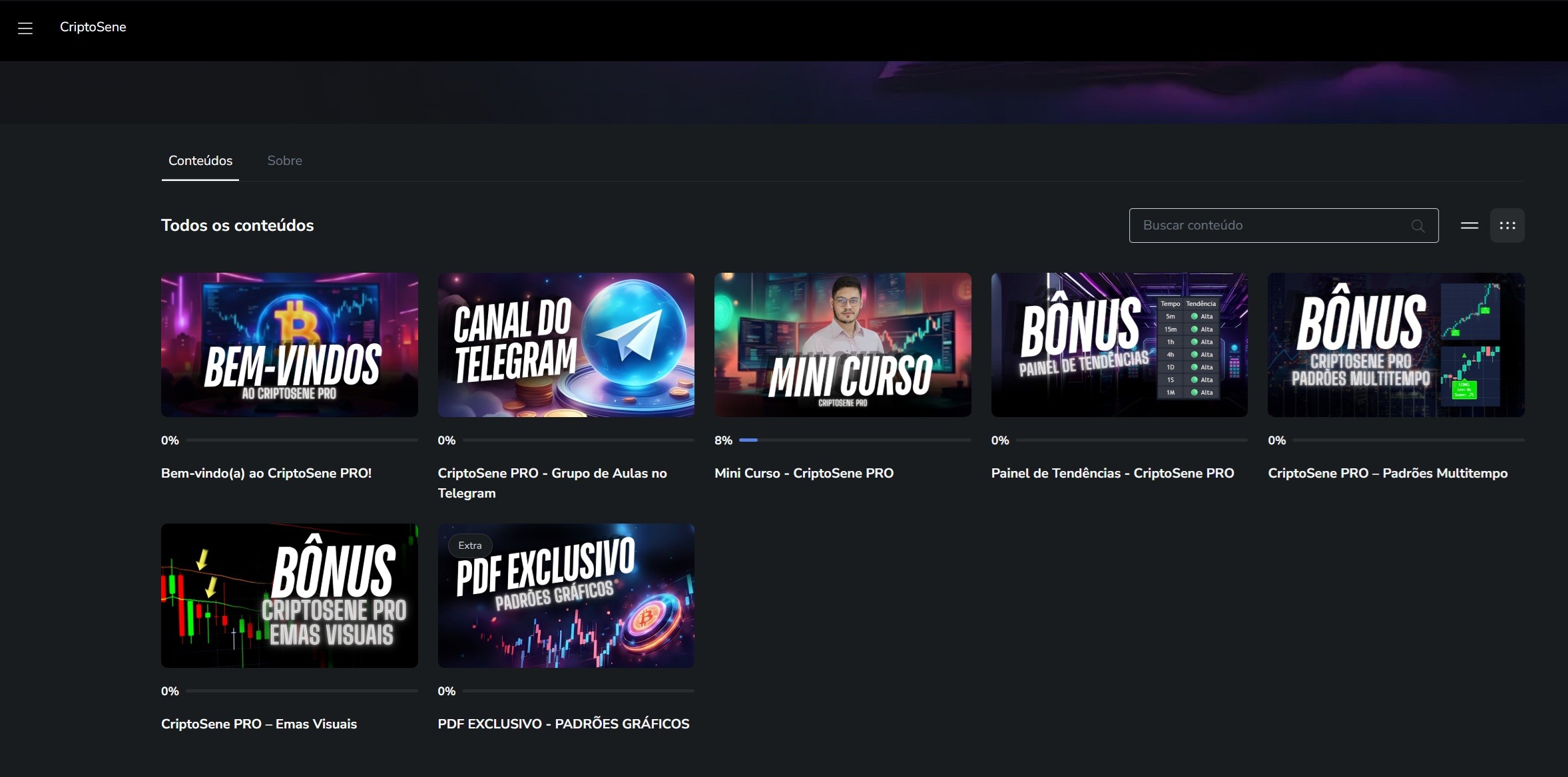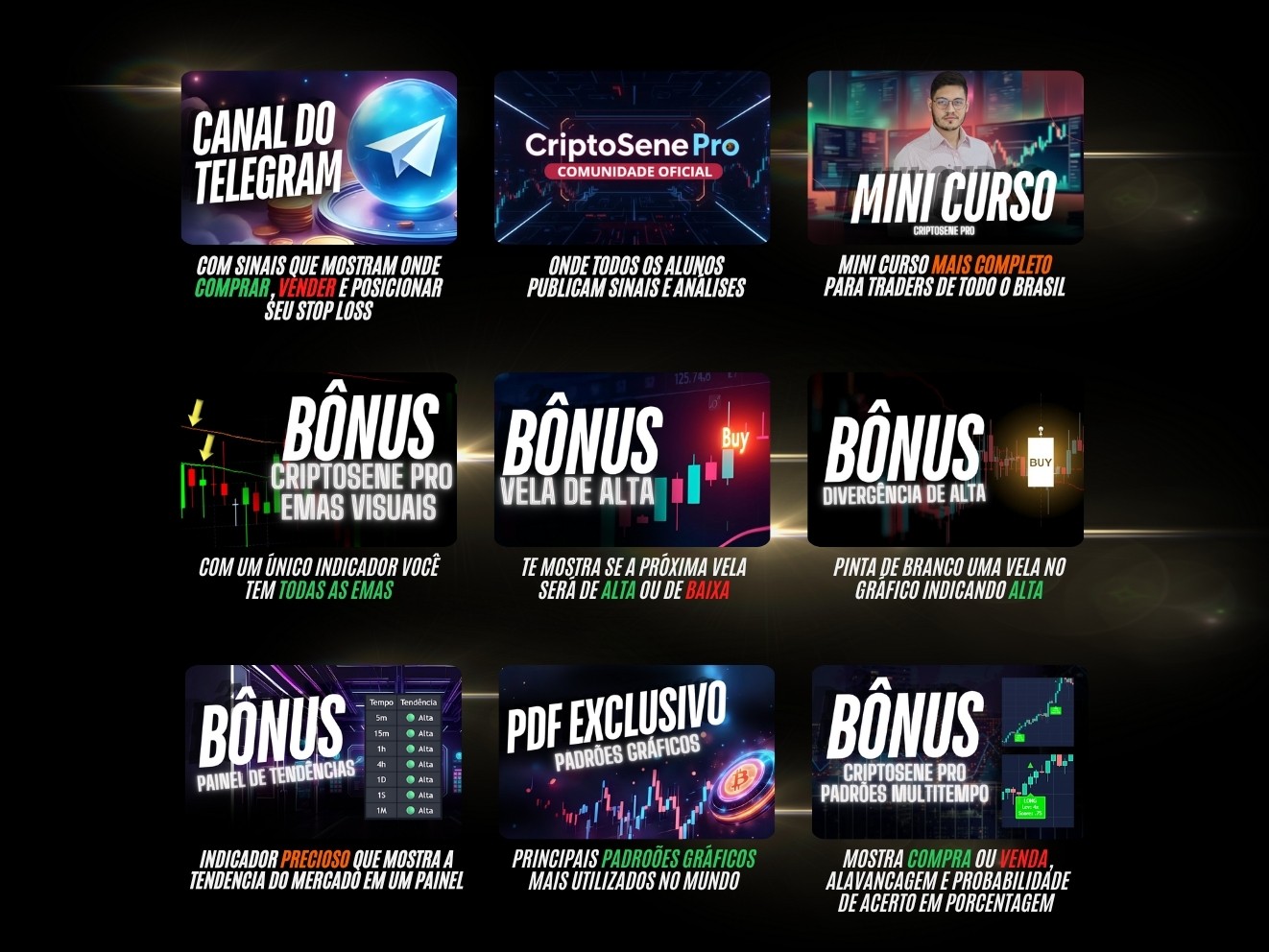 Um ecossistema completo criado pra quem quer aprender, para quem quer operar sem ficar com a cabeça preocupada e lucrar com mais segurança. Um ambiente com aulas, ferramentas que só tem no CriptoSene PRO, sinais para te mostrar oportunidades e os melhores indicadores do mercado em um só lugar.
